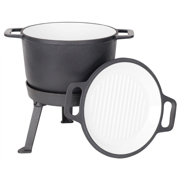 Litinový smaltovaný lovecký hrnec nabízí skvělou alternativu k grilování. Je velmi snadné s ním manipulovat, protože na rozdíl od grilu nevyžaduje neustálou pozornost. Toto varné zařízení má silné dno a stěny a při vystavení vysokým teplotám se nedeformuje. Litina použitá při výrobě tohoto hrnce vede teplo účinně, a proto zajišťuje stabilní, rovnoměrné vaření. Hrnec z litiny umožňuje lovit venku i v chladnějších dnech. Vzhledem k tomu, že teplo ukládá po dlouhou dobu, jídla se budou vždy podávat horká. Litina nevydává žádné škodlivé látky a zaručuje bezkonkurenční chuť a vůni jídel přímo z ní podávaných. Hrnec byl uvnitř potažen smaltem, což usnadňuje čištění a téměř bezstarostnost.