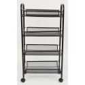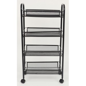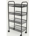 Kolečkový regál vhodný do kuchyně, koupelny nebo do kanceláře. Má čtyři volně pohyblivá kolečka. Díky lehké konstrukce se s ním snadno manipuluje. Vozík je vyrobek z lakovaného kovu, barva cerna. Dobře odolává rzi. Ideální na umístění drobných předmětů.